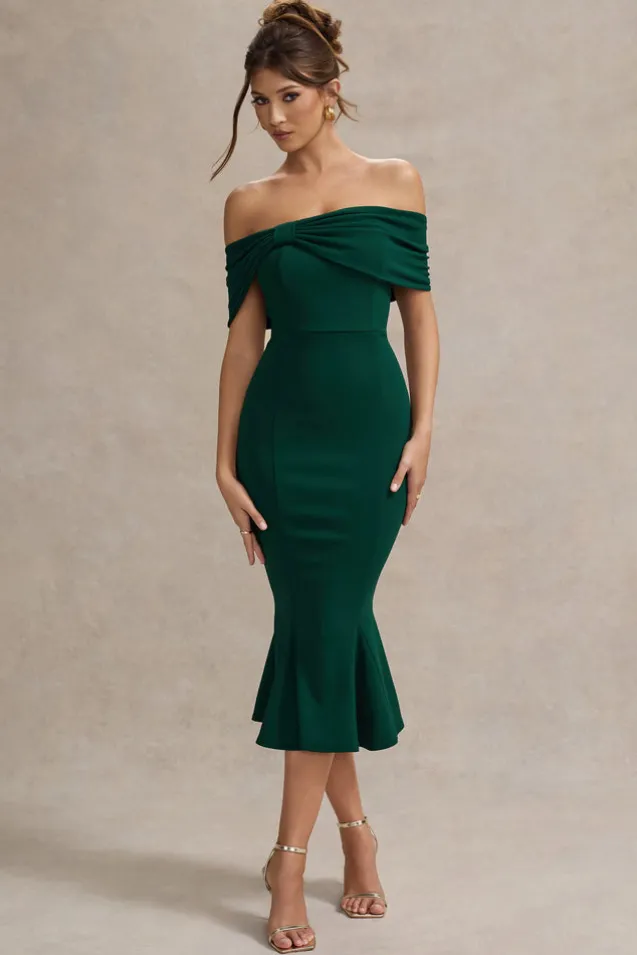 Lydia | Bottle Green Bardot Bow Detail Midi Dress