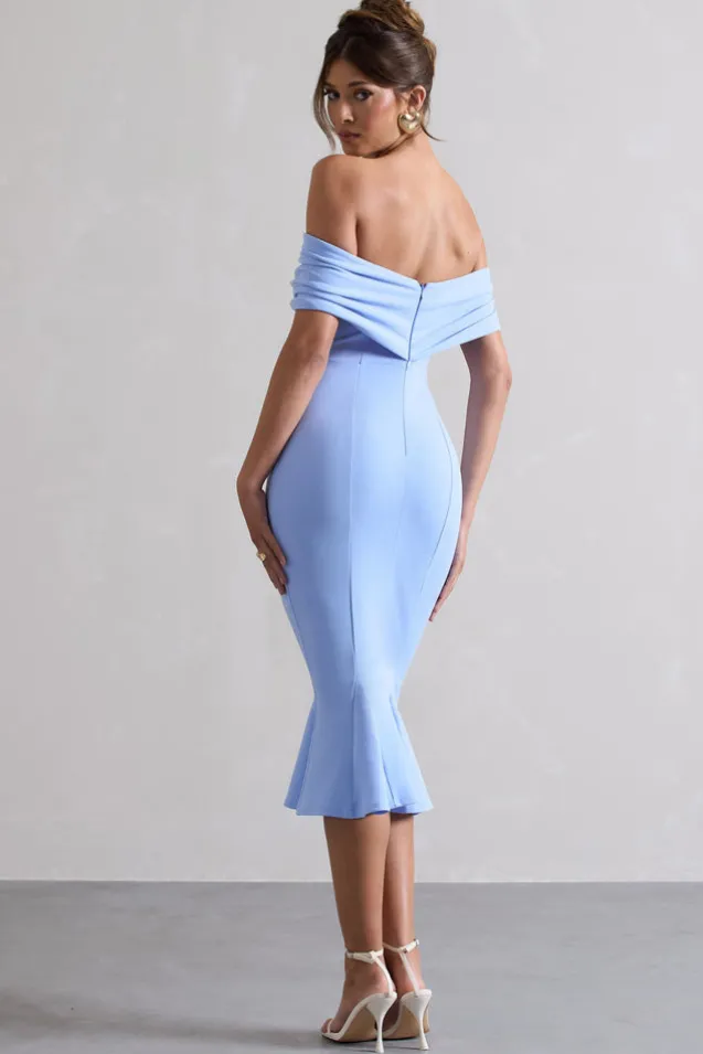 Lydia | Sky Blue Bardot Bow Detail Midi Dress