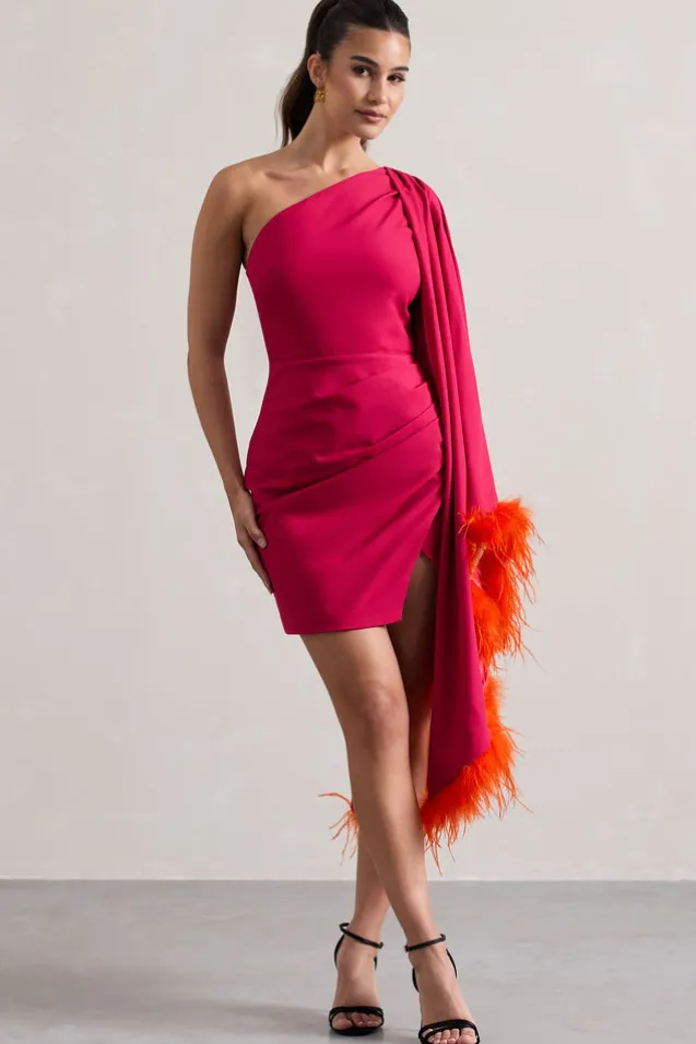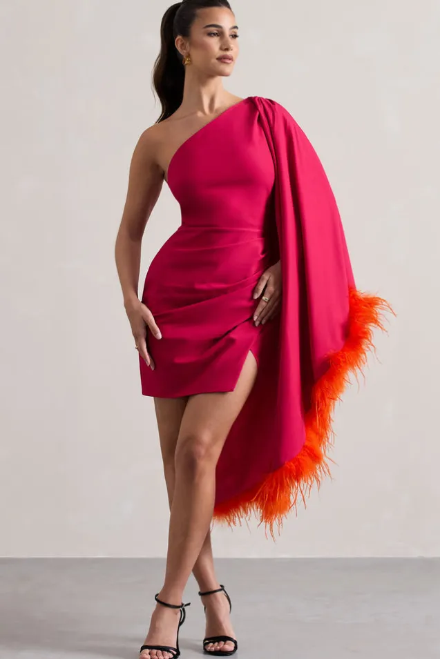 Step into the summer swing in Lyrika, our latest statement mini. Arriving in a bold dark pink hue of a premium crepe, this mini dress showcases an asymmetric neckline and a captivating cape sleeve finished with a vibrant orange feather trim.Features – Premium crepe- Bodycon fit – Asymmetric neckline – Cape sleeve- Invisible zip closure – Feather trim- Mini length Sizing & Fit Model is 5’7″ and wears UK size 8/US size 4Product Information Designed exclusively by Club L London Fully lined with some stretch Premium crepe in Dark Pink (86% Polyamide, 14% Elastane)Trim (100% real feathers)85cm total length
