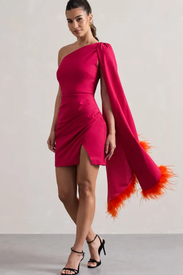 Lyrika | Dark Pink Asymmetric Cape Sleeve Mini Dress With Feathers