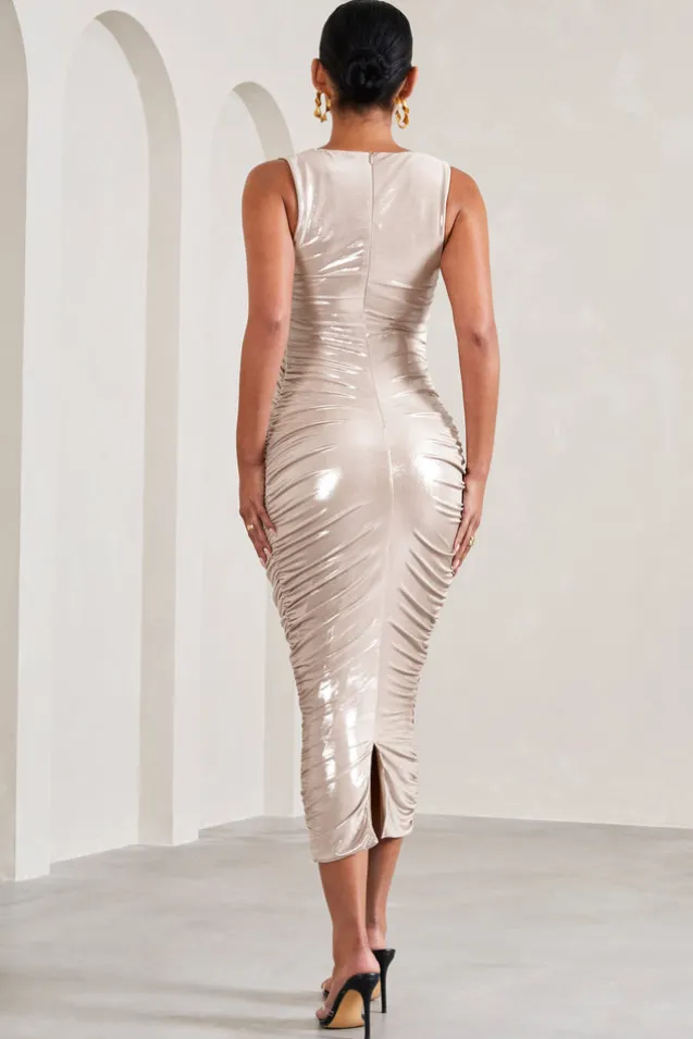 Mabel | Gold Metallic Cowl-Neck Ruched Maternity Midi Dress
