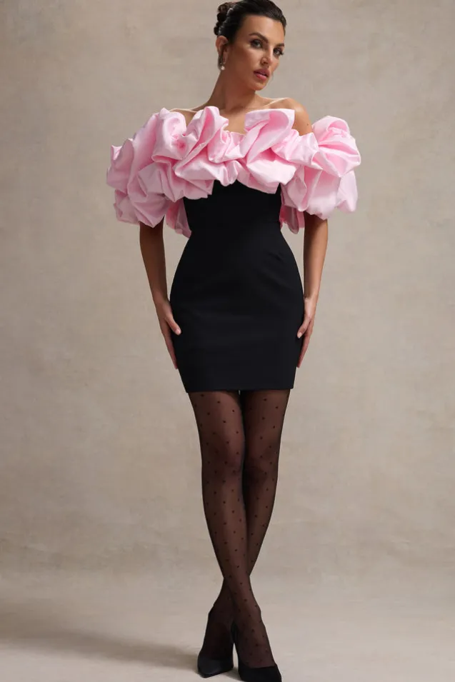 Macaron | Black Bardot Mini Dress With Pink Ruffle Trim