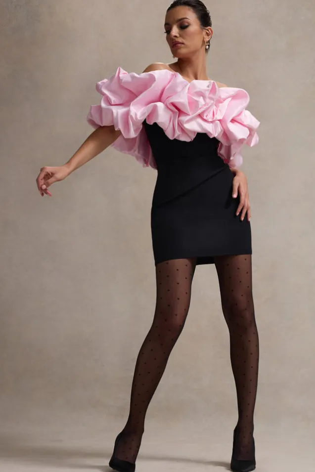 Delivering a playful charm, this sweet mini is on every birthday girls wish list. Macaron arrives in a flattering bodycon silhouette of our premium crepe highlighted by a subtle boned bodice for extra support. An extravagant pink ruffled neckline adds a statement element to this LBD, making it the perfect pick for that special event.Features – Premium crepe- Bodycon fit – Volume satin bardot neckline – Boned bodice- Invisible zip closure- Mini length Sizing & Fit Model is 5’7 and wears UK size 8/US size 4 Product Information Designed exclusively by Club L London Lined/good stretch Premium stretch crepe in Black (95% Polyester, 5% Elastane)Premium satin in Pink (100% Polyester)85cm total length