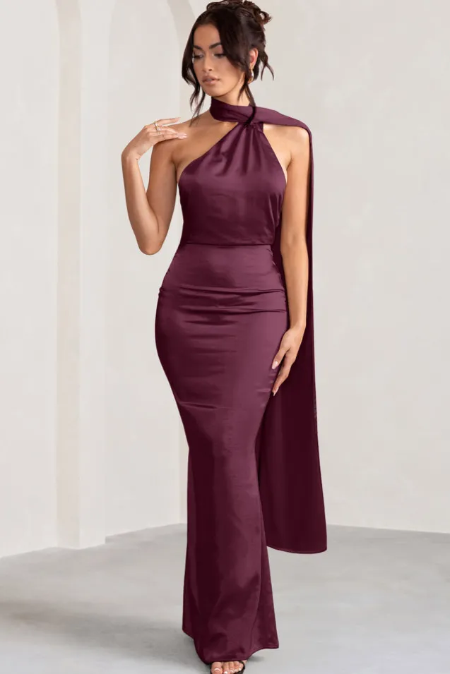 Mademoiselle | Burgundy Satin Asymmetric Scarf Neck Backless Maxi Dress