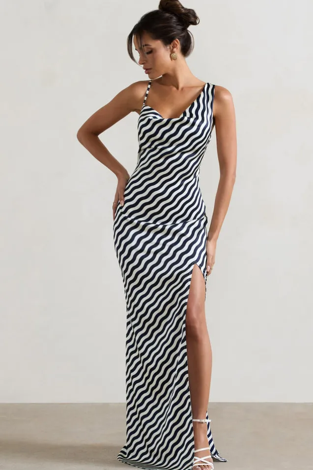 Magnetic | Navy Wave Print Cowl-Neck Split Maxi Dress