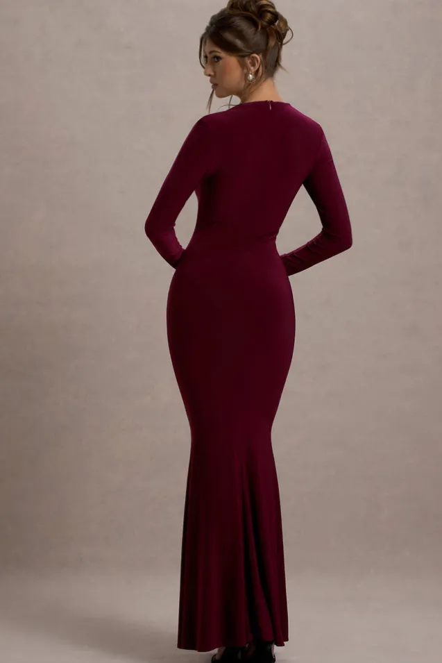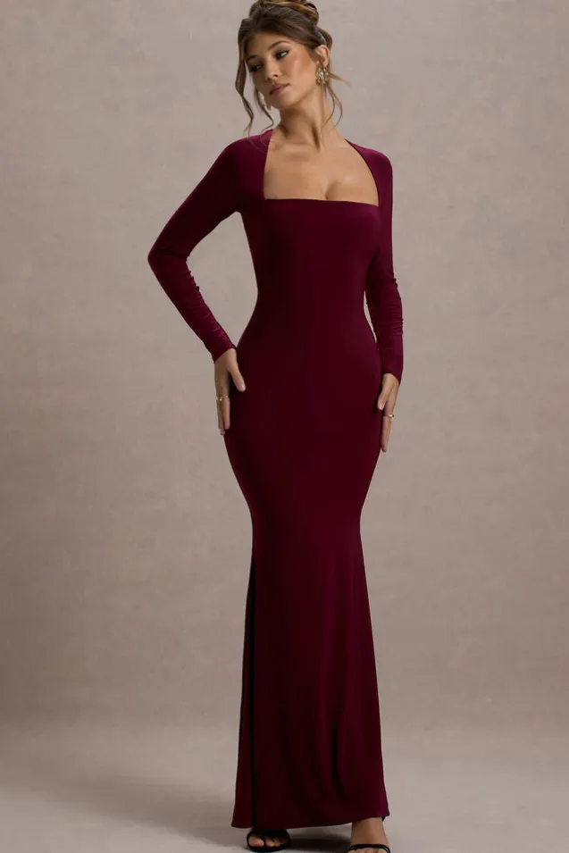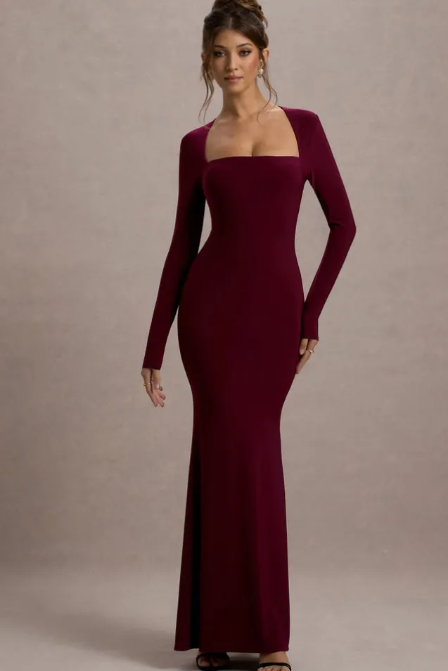 Defined by understated elegance and a flattering fit, Maja is a sophisticated option for your next special occasion. Crafted from our premium jersey in a rich burgundy hue, this long-sleeve maxi dress features a sleek square neckline that enhances your silhouette. The smooth, body-hugging fabric ensures both comfort and allure, while the full-length design adds a touch of glamour. Style Maja with metallic accessories and soft waves for an effortlessly chic look that will leave a lasting impression.Features – Premium jersey- Square neckline – Long sleeves – Invisible zip closure- Cascade hemline- Maxi lengthSizing & Fit Model is 5’7 and wears UK size 8/US size 4 Product Information Designed exclusively by Club L London Double layered with some stretch Premium jersey in Burgundy (95% Polyester, 5% Elastane) 142cm total length