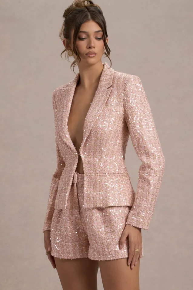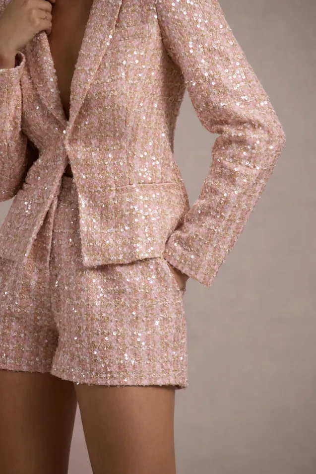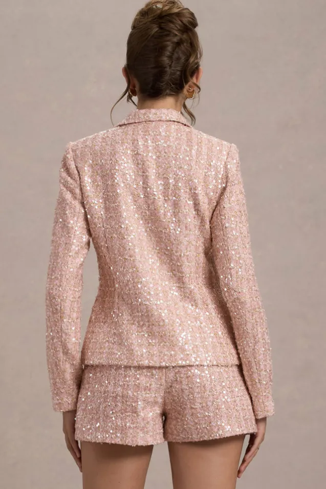 Both sophisticated and elegant, Marena is a premium staple that every wardrobe deserves. Crafted in a blush pink boucle, this blazer is elevated by subtle sequins that are scattered throughout its tailored silhouette. Complete with a hook fasting and mock welt pockets, theres so much to love with Marena.Features – Premium sequin boucle- Tailored fit- Peak lapels- Long sleeves- Hook & eye fastening- Mock welt pocketsSizing & Fit Model is 5’7 and wears UK size 8/US size 4 Product Information Designed exclusively by Club L London Lined with no stretch Premium sequin boucle in Pink (96% Polyester, 4% Metallised Fibre) Lining (97% Polyester, 3% Elastane)