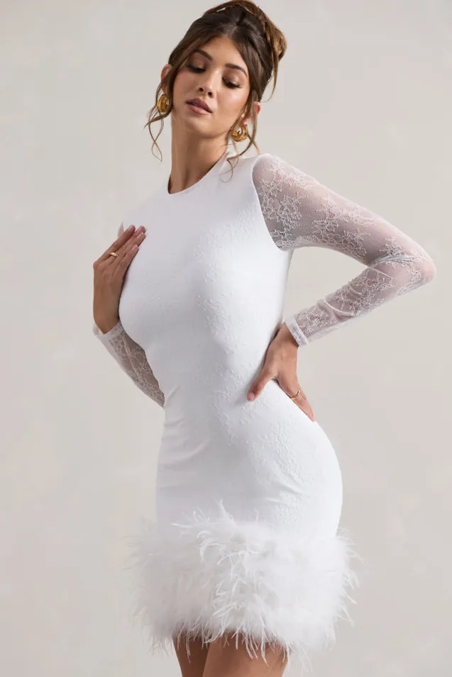 Mariana | White Lace Long-Sleeve Mini Dress With Feather Trim