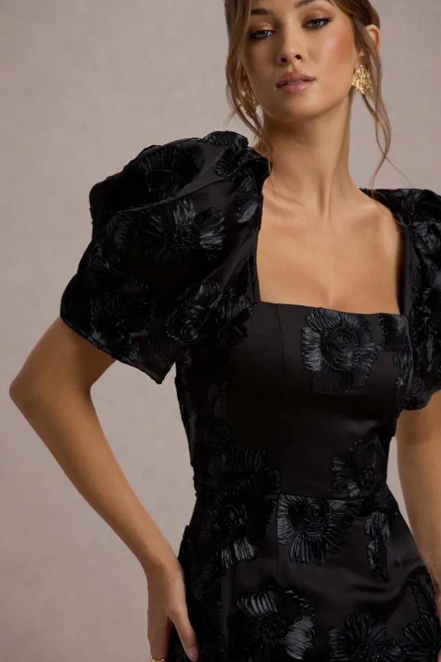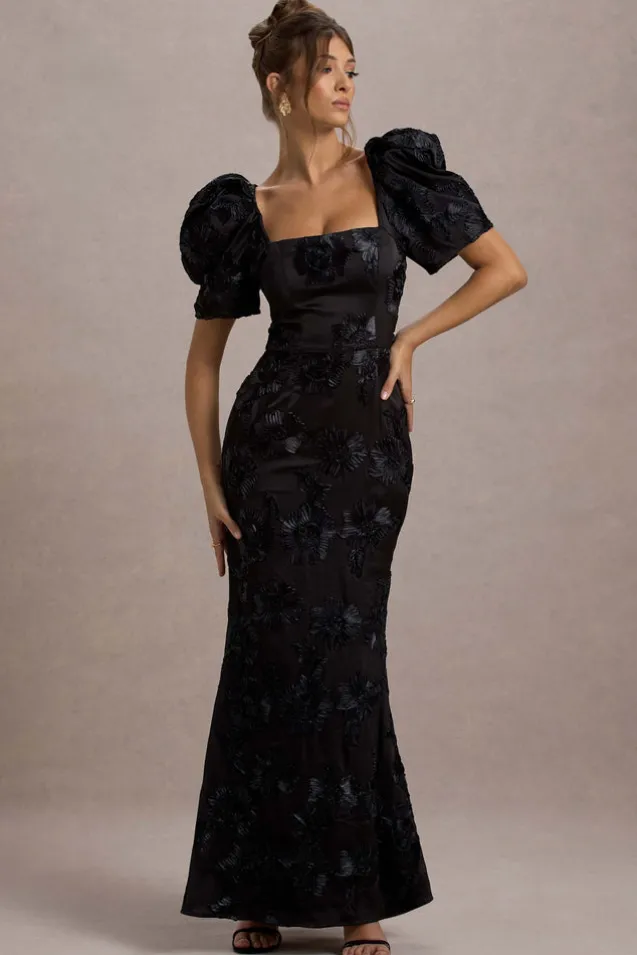 Marilla | Black Mesh Floral Square-Neck Puff-Sleeve Maxi Dress