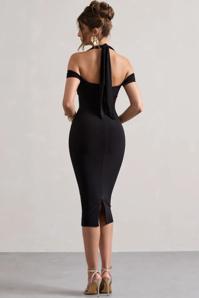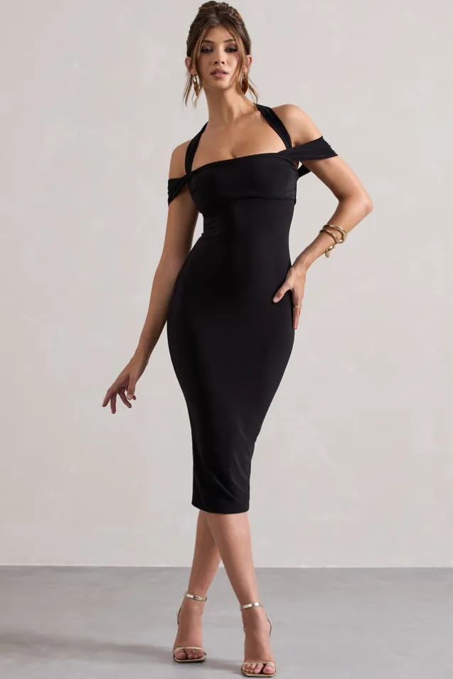 Marla | Black Halter-Neck Draped-Sleeve Midi Dress