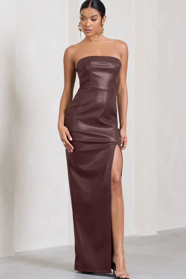 Marlene | Burgundy Faux Leather Strapless Bandeau Split Maxi Dress