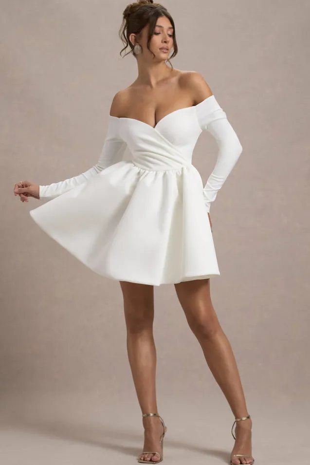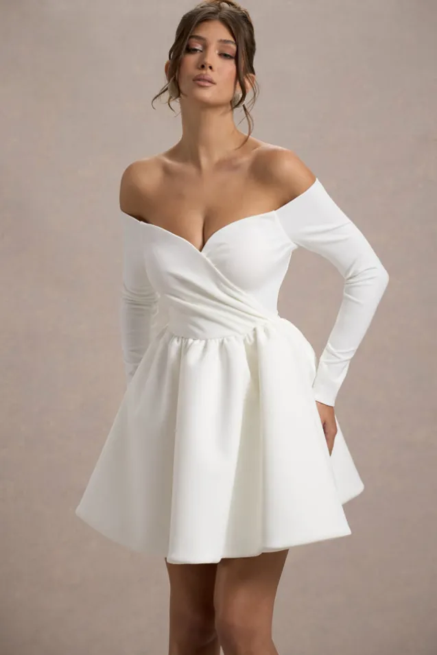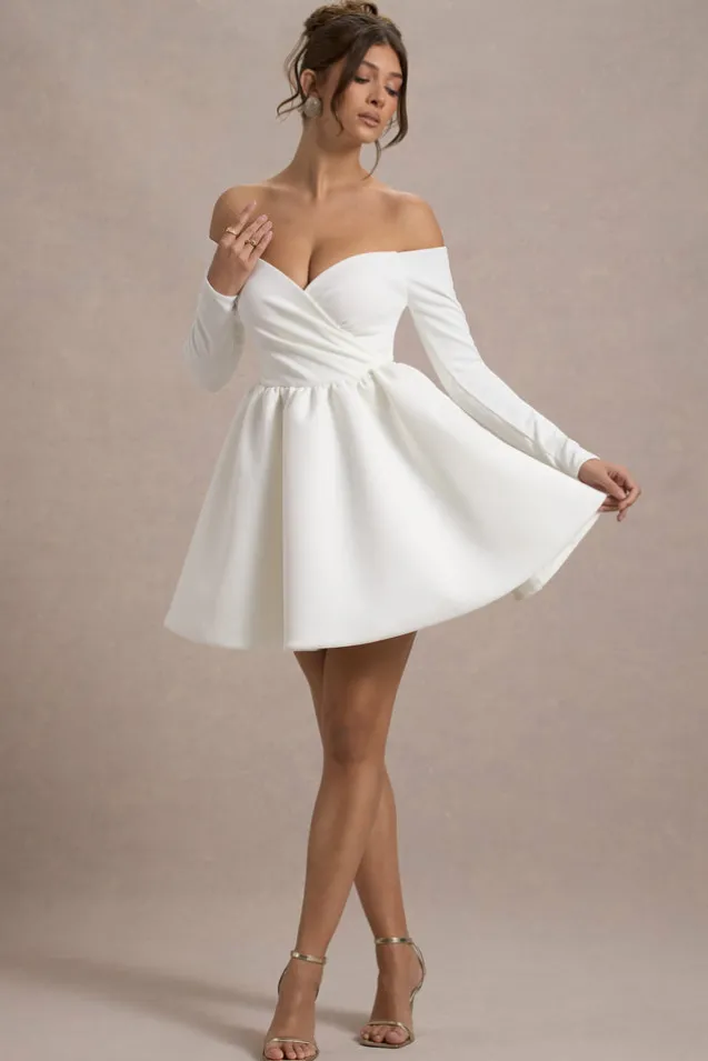 Make your mark in in our latest mini Marta. Designed in a premium scuba crepe that gives this white mini dress its structured skater skirt, Marta boasts an elegant bardot neckline and flattering wrap bodice. For the Ultimate garden party look style this mini with some strappy stilettoes. Features – Premium scuba crepe- Bardot neckline- Long sleeves – Wrap bodice- Invisible zip closure – Skater skirt- Mini length Sizing & Fit Model is 5’7 and wears UK size 8/US size 4Product Information Designed exclusively by Club L London Fully lined with good stretch Premium scuba crepe in White (95% Polyester, 5% Elastane) 85cm total length