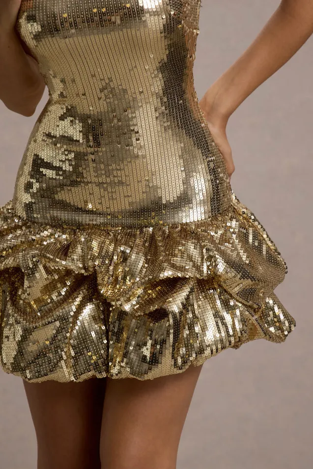 Mirabelle | Gold Sequin Bandeau Mini Dress With Puff Hem