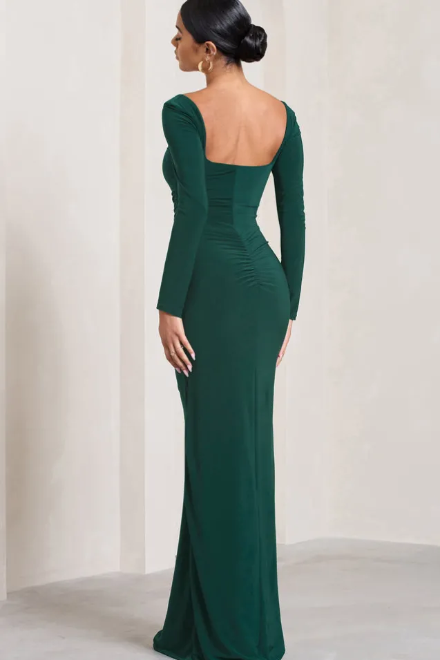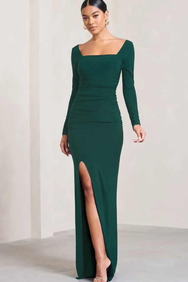 My Pleasure | Bottle Green Square Neck Ruched Maxi Dress