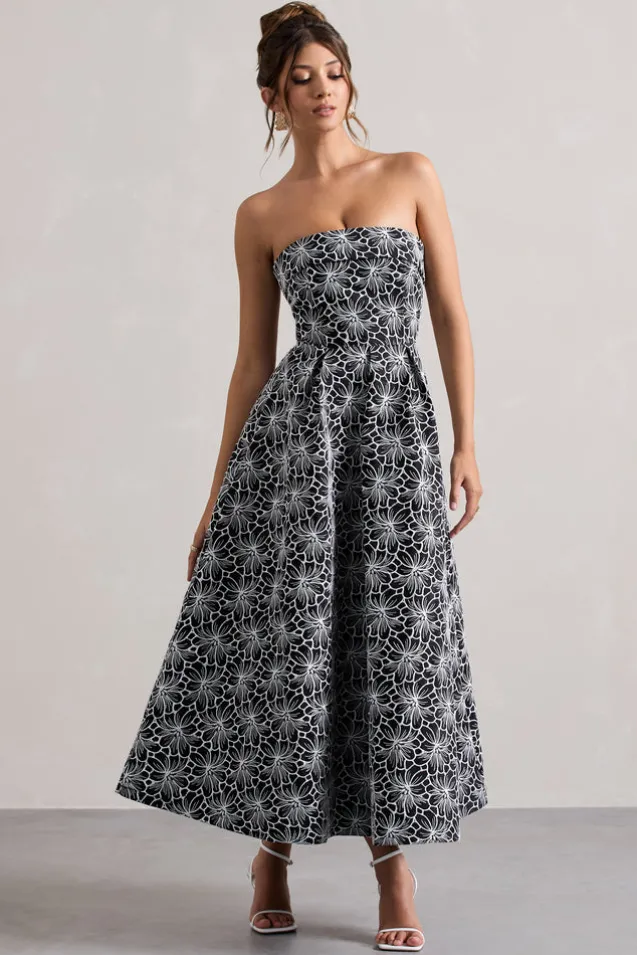 Classic, timeless and sophisticated are three words that perfectly describe Myleen. Crafted in a premium black cotton poplin, this strapless midi dress is defined by a luxurious floral lace overlay and pleated skater skirt that adds dimension to an otherwise minimalistic silhouette. Get race day ready by styling yours with some sparkling accents and strappy stilettos.Features – Premium cotton poplin- Organza overlay- Folded bandeau neckline – Boned bodice- Invisible zip closure – Pleated skirt- Midi length Sizing & Fit Model is 5’7 and wears UK size 8/US size 4Product Information Designed exclusively by Club L London Lined with no stretch Premium cotton poplin in Black (55% Cotton, 45% Elastane) Lace overlay (100% Polyester)125cm total length