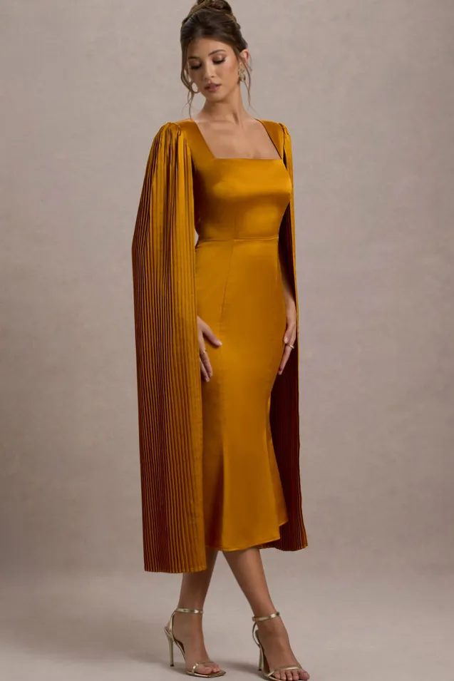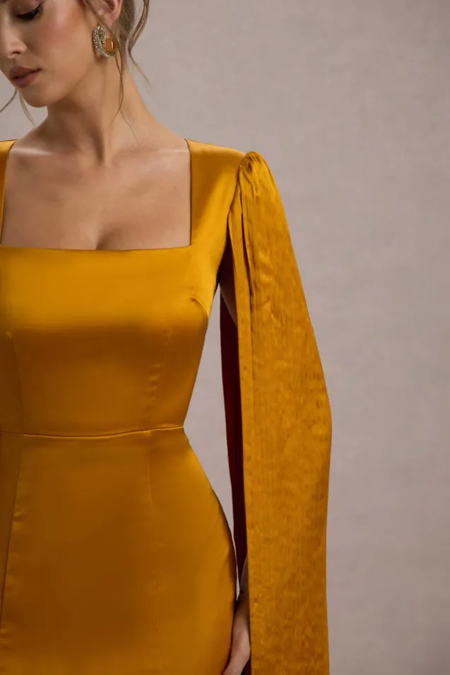 If sophistication was a dress, Nalda would be it. Crafted in a deep mustard hue of our premium satin, this timeless midi dress is detailed by a flattering square neckline, pleated cape sleeves and elegant flute hem. For the perfect wedding guest ensemble, style yours with some bouncy curls and earrings like Glint.Features – Premium satin- Square neckline – Pleated cape sleeves- Invisible zip closure – Flute hemline – Midi length Sizing & Fit Model is 5’7 and wears UK size 8/US size 4 Product Information Designed exclusively by Club L London Lined with some stretch Premium satin in Mustard (97% Polyester, 3% Elastane) Lining (95% Polyester, 5% Elastane)120cm total length