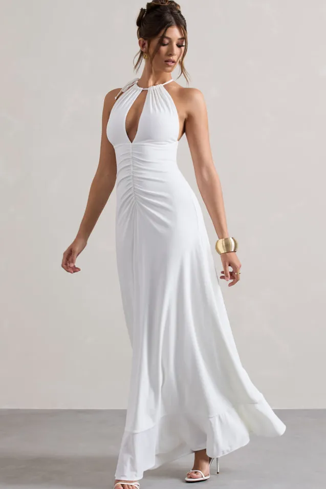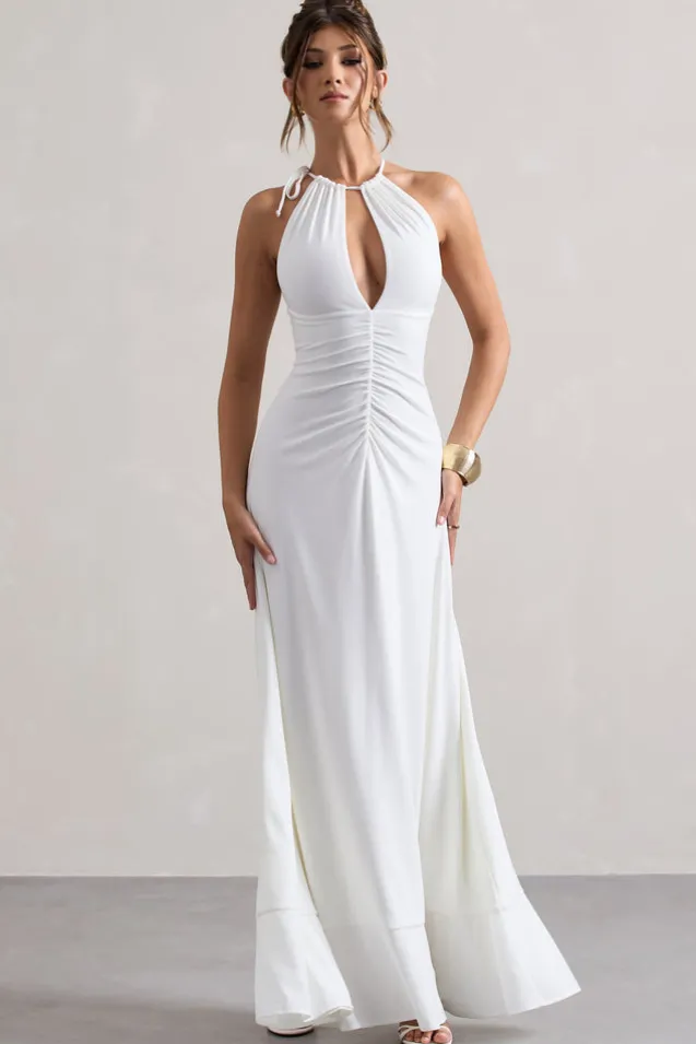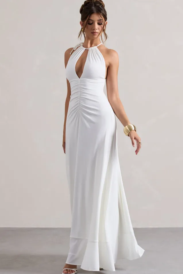 A core wardrobe essential this summer season, elevate your everyday with Naria. Amplifying its alluring silhouette, this cream maxi dress features a self-tie neckline, chest cut-out and flattering front ruching. For a romantic date-night ensemble, style yours with some gold accents like our glistening bangle, Boa.Features – Premium stretch solton- Self-tie neckline – Sleeveless- Keyhole cut-out- Ruched front- Maxi length Sizing & Fit Model is 5’7 and wears UK size 8/US size 4 Product Information Designed exclusively by Club L London Double layered with good stretch Premium Solton in Cream (94% Polyester, 6% Elastane) 155cm total length