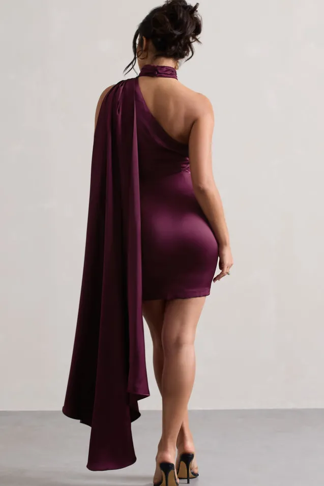 Natalie | Plum Satin One Shoulder Mini Dress With Scarf Detail
