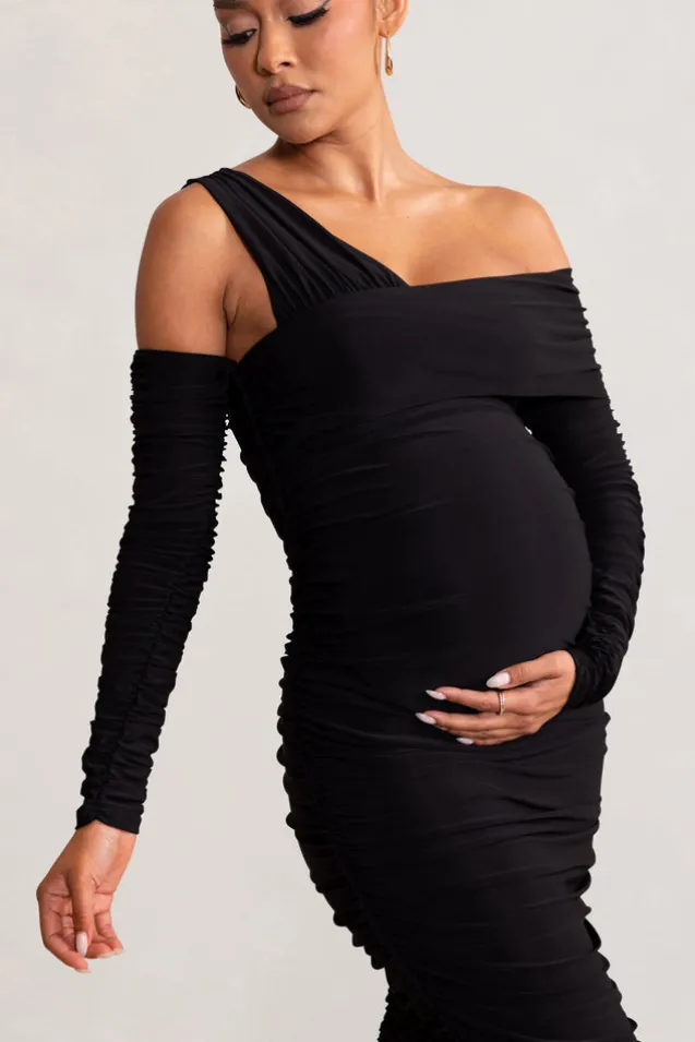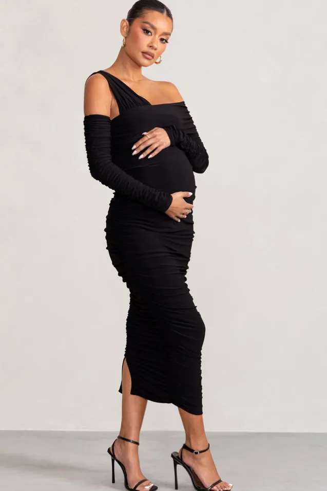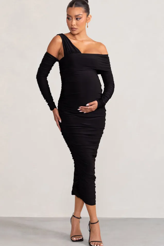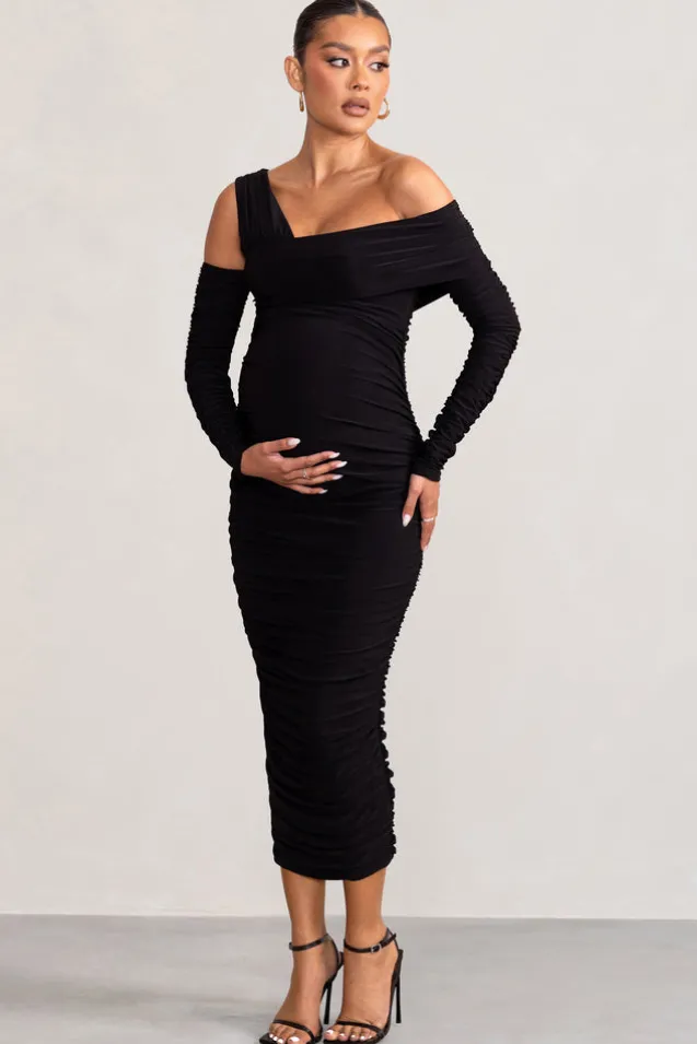 Neile | Black Asymmetric Bardot Maternity Midi Dress with Sleeves