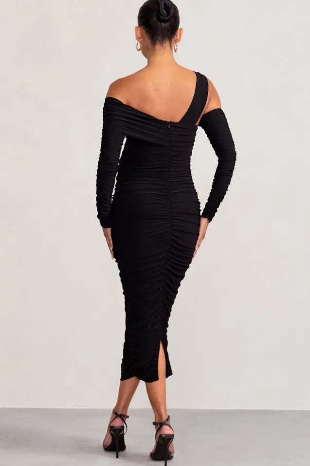 Sophisticated with a glamorous twist, Neile is the perfect choice for any upcoming social engagements. Crafted in our premium double-lined jersey, this midi dress in classic black will sculpt your silhouette so that you can step out in confidence. Featuring an asymmetric Bardot neckline, long sleeves with a cut-out, and full body ruching, Neile is guaranteed to make a statement.Features Asymmetric Bardot necklineLong sleevesMidi dressConcealed back zipRuched detailingPremium double-lined jersey fabricSizing & Fit Model is 5’.8.5 and wears UK size 8/US size 4 Product Information Designed exclusively by Club L London Good stretchLength from top of shoulder to hem: 140cm