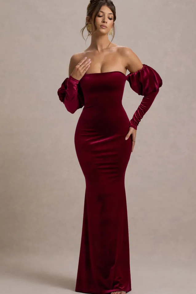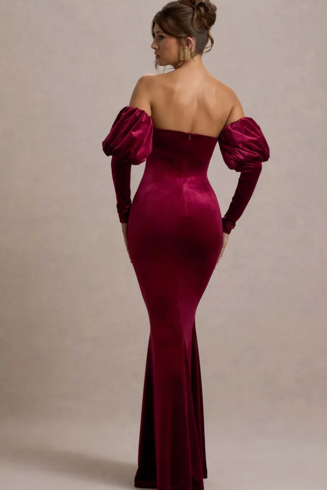 Neoma | Berry Velvet Bardot Puff-Sleeve Maxi Dress