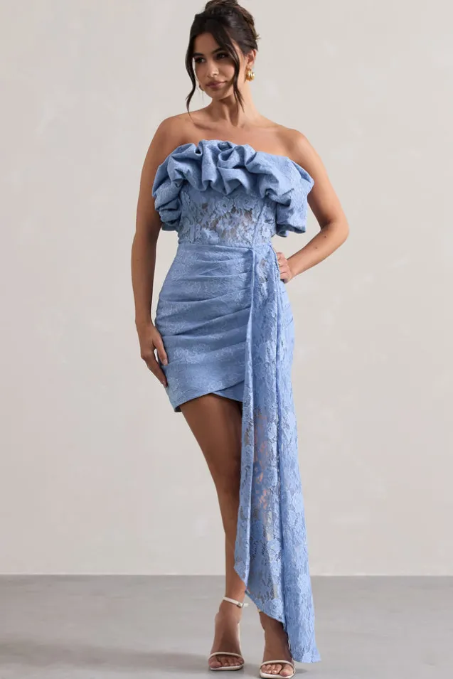 Neptune | Blue Lace Strapless Ruffled Mini Dress With Drape
