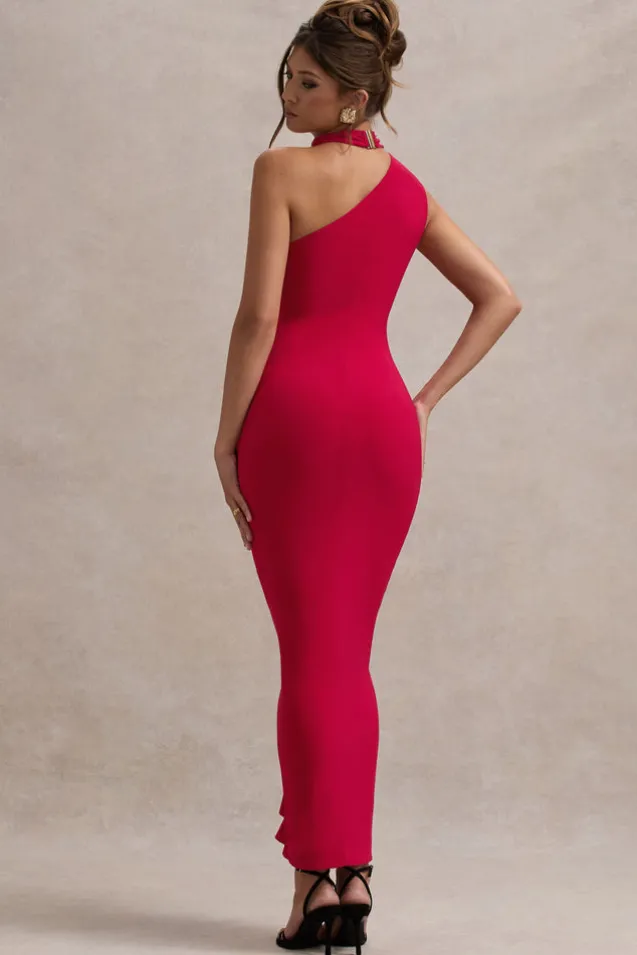 With multiple elevated details that bring the drama, add Nevaeh to your evening repertoire. Crafted in a figure-skimming jersey, this red maxi dress boasts an asymmetric neckline, hook-closed collar and eye-catching split trimmed with ruffles. Let Nevaeh do the talking this event season and team yours with a classic tousled bun.Features – Premium stretch jersey- Asymmetric neckline – Hook-closed collar- Invisible zip closure – Ruffled split- Maxi length Sizing & Fit Model is 5’7 and wears UK size 8/US size 4 Product Information Designed exclusively by Club L London Double layered with good stretch Premium jersey in Red (95% Polyester, 5% Elastane) 140cm total length