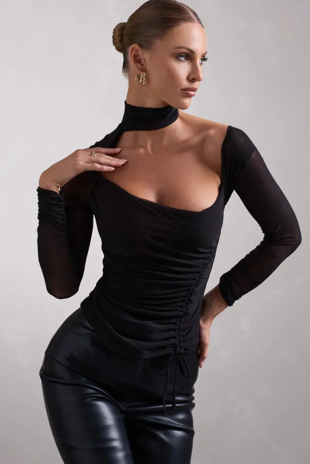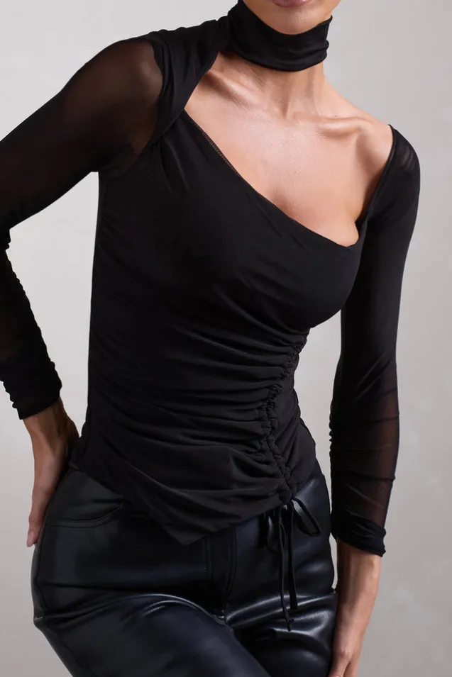 Nicole | Black Ruched Mesh Asymmetric Top With Long Sheer Sleeves