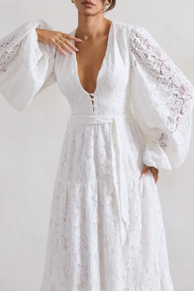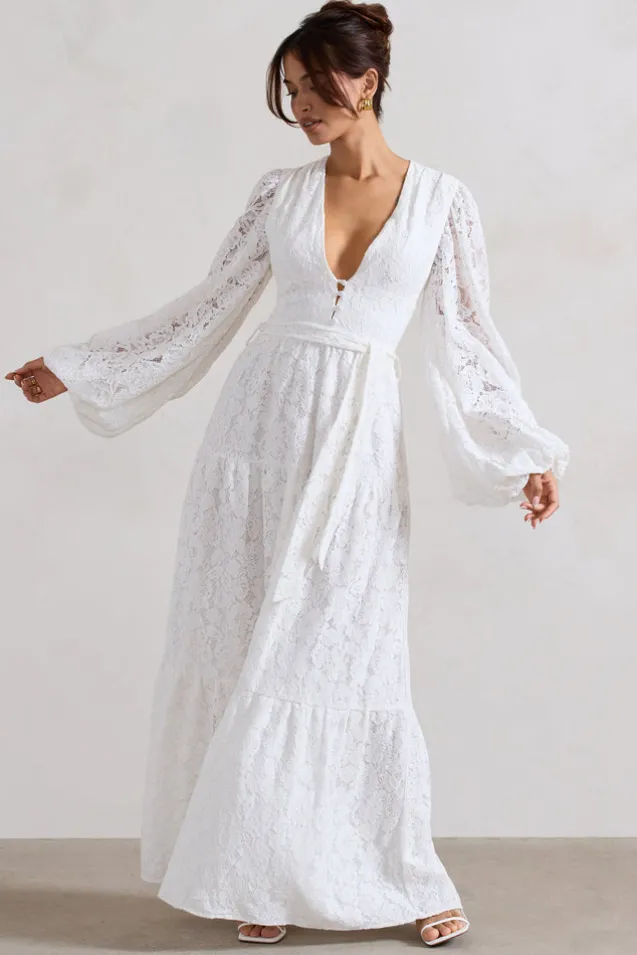 Nixie | White Lace Puff-Sleeve Layered Maxi Dress With Belt