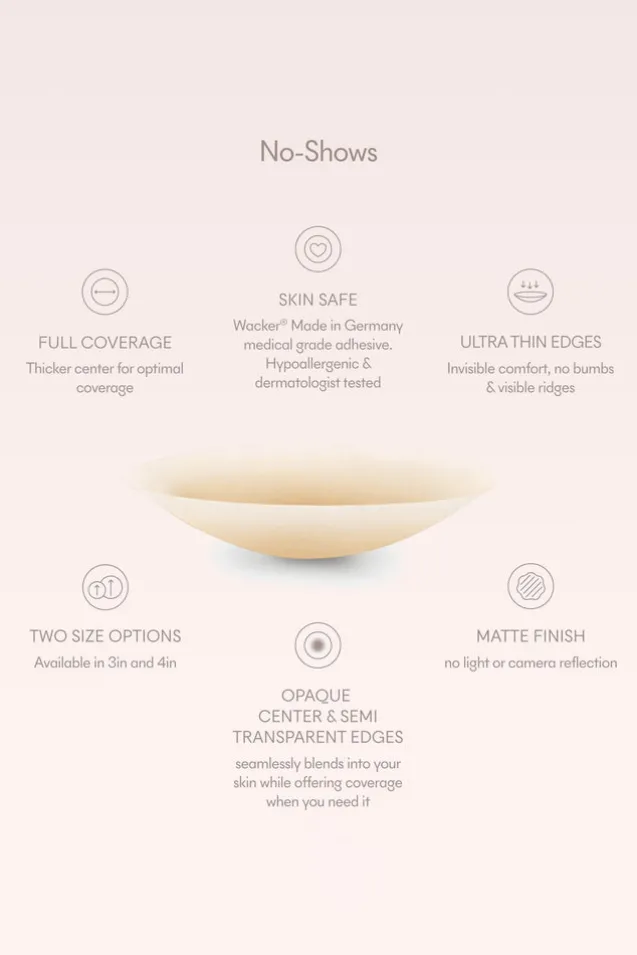 Introducing NOOD’s No-Show round nipple covers, made from their signature SkinFinish™ silicone for a smooth and seamless look that’s better than going braless. We recommend wearing these reusable nipple covers underneath NOOD’s Shape Tape for optimal support.Features – Reusable 50-100 times with proper care- Invisible SkinFinish™ matte silicone- All-day comfort- Skin-friendly- Sweatproof & waterproof- Sustainable packaging (FSC ® paper, soy inks, 100% recyclable)With great cleavage comes great responsibilityNOOD adhesive products are made with very strong acrylic adhesive and must be used with proper care in accordance with safety guidelines to avoid skin injury.How To Apply*Please note, to receive a full refund for NOOD products all items must be returned to us unworn, unused and in the same condition they were received, with their packaging unopened.