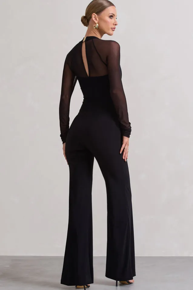 On Track | Black Flared-Leg Jumpsuit With Sheer Sleeves
