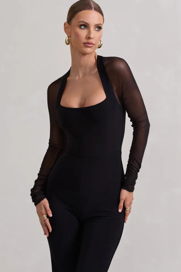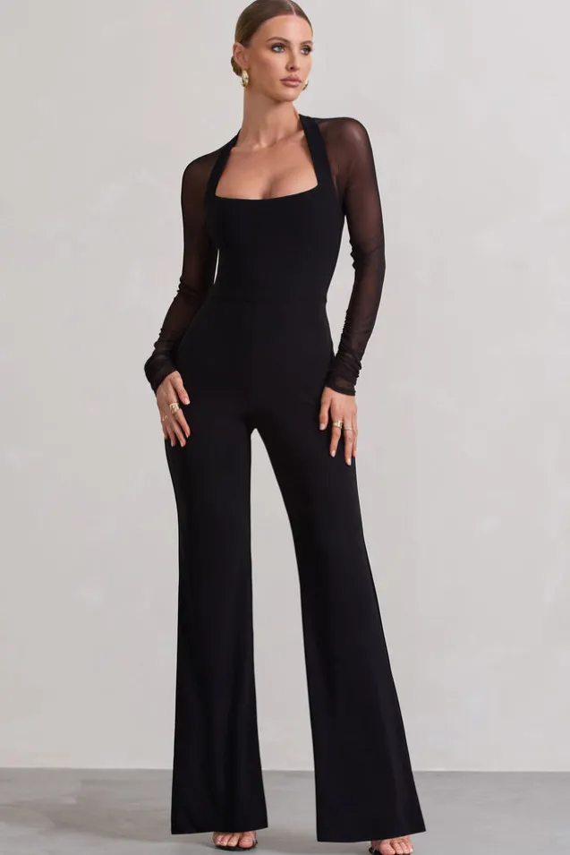 A staple for every season, this black jumpsuit is a form-flattering fit for any occasion. Crafted in a premium stretch jersey, On Track channels contrast through its long mesh sleeves and back. Paired with some strappy stilettos like Crossed Wires, this flared-leg jumpsuit would be perfect for an upcoming date night. Features – Premium stretch jersey- Square neckline – Long mesh sleeves- Swan hook closure – Keyhole cut out- Wide flared legs Sizing & Fit Model is 5’8″ and wears UK size 8/US size 4 Product Information Designed exclusively by Club L London Double layered with good stretch Premium jersey in Black (95% Polyester, 5% Elastane) 81.5cm total inside leg length
