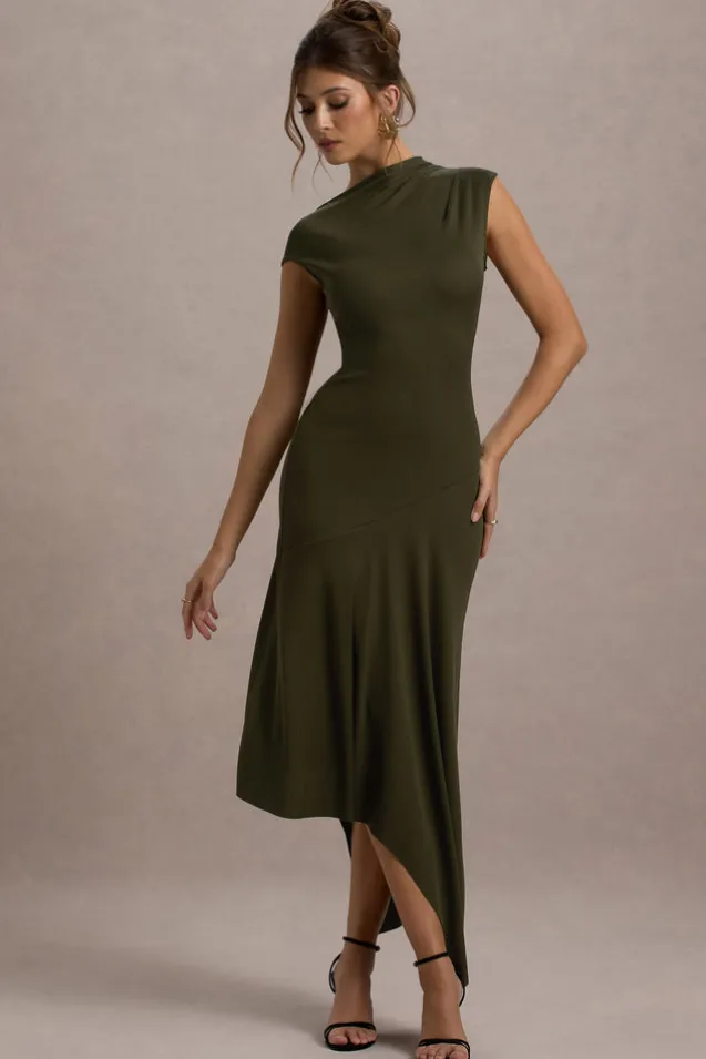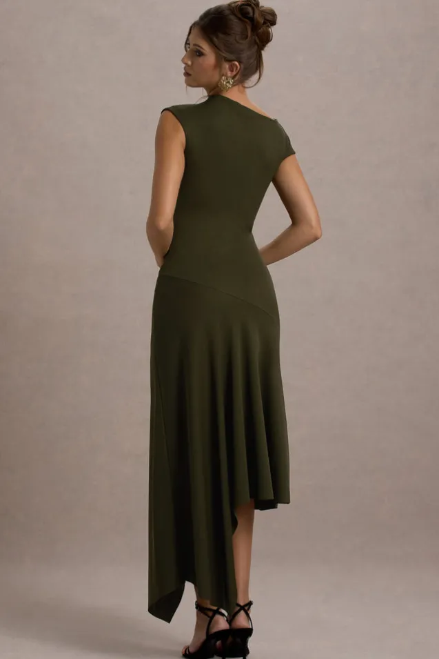 Ondine | Khaki Asymmetric Draped Midi Dress