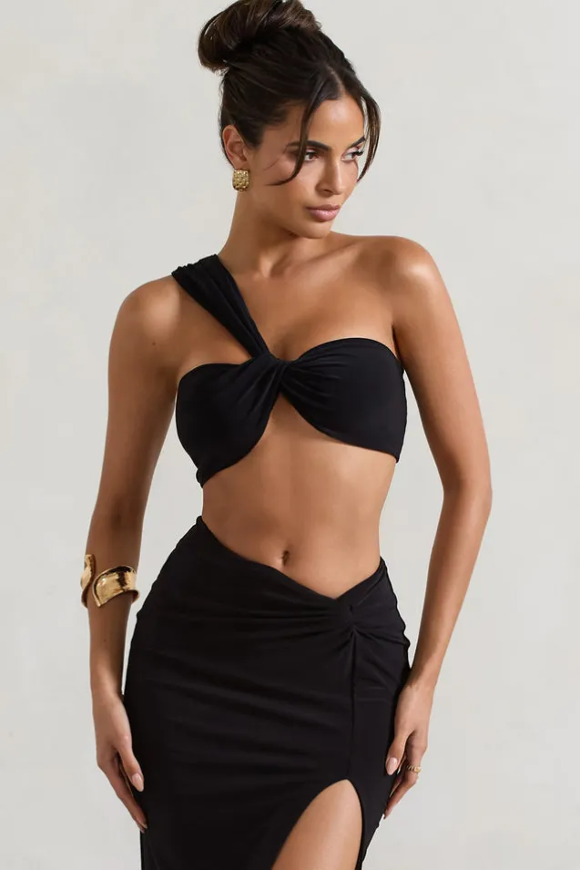 After sunbathing on the beaches of Bermuda, you’ll need a classic black bralette for evening cocktails. This asymmetric option named Open Heart comes in premium stretch jersey with one shoulder strap that twists at the bustline.Features- Premium jersey fabric- Bralette style- Single shoulder strap- Twisted knot detail- Rear zip closureSizing & FitModel is 5’6″ and wears UK size 8/US size 4Product InformationDesigned exclusively by Club L LondonFully lined with good stretchPremium jersey in Black (95% Polyester, 5% Elastane)