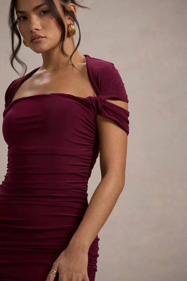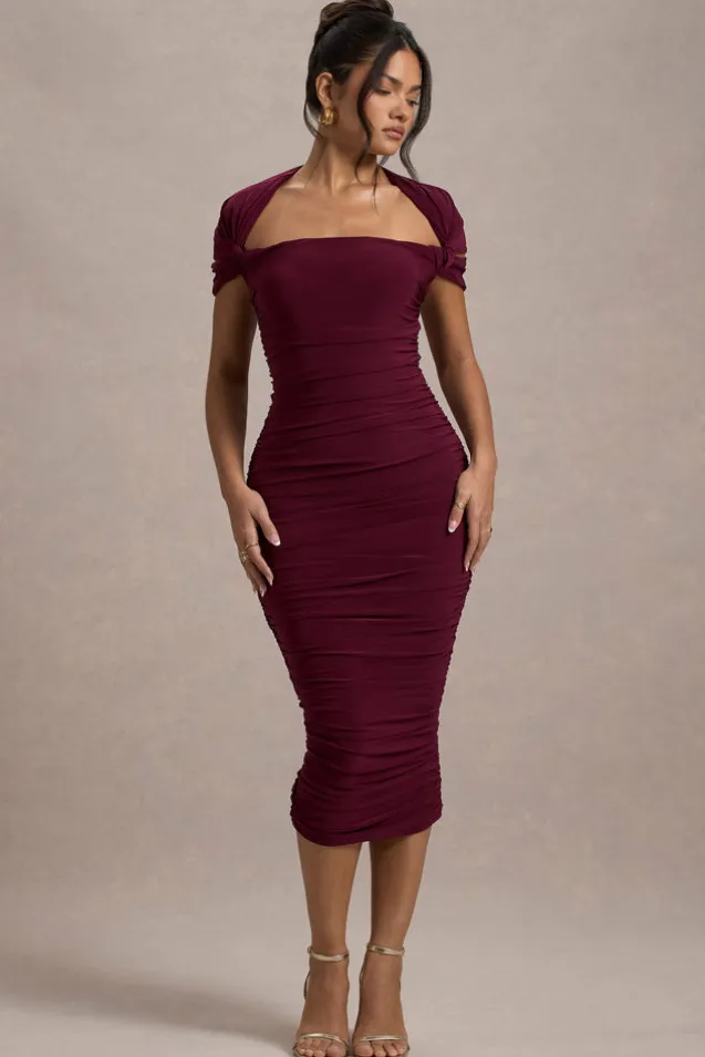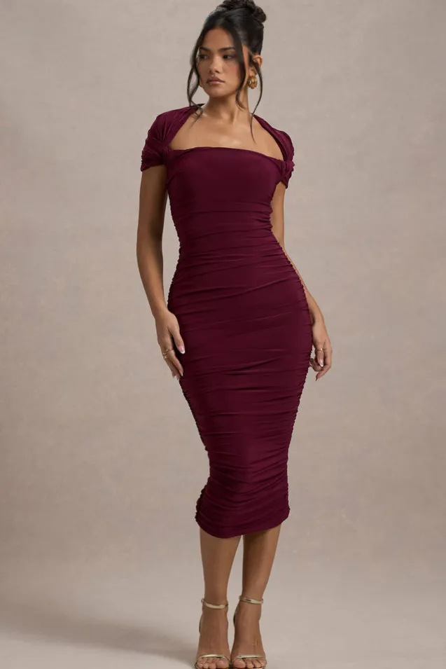 Every wardrobe needs a ruched midi dress and Paxos is the perfect choice. Expertly cut in an burgundy shade of our signature stretch jersey, with ruching to sculpt your figure. Paxos is detailed with short twisted sleeves and would look stunning styled with a tousled bun and some gold accents.Features – Premium stretch jersey- Fully ruched- Square neckline- Short sleeves- Invisible zip closure – Split hemline- Midi length Sizing & Fit Model is 5’6″ and wears UK size 8/US size 4Product Information Designed exclusively by Club L London Double layered with good stretch Premium jersey in Burgundy (94% Polyester, 6% Elastane)120cm total length