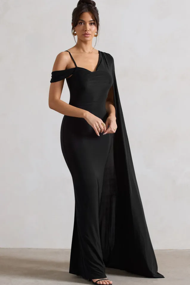 Pedra | Black One Shoulder Cape Sleeve Draped Maxi Dress