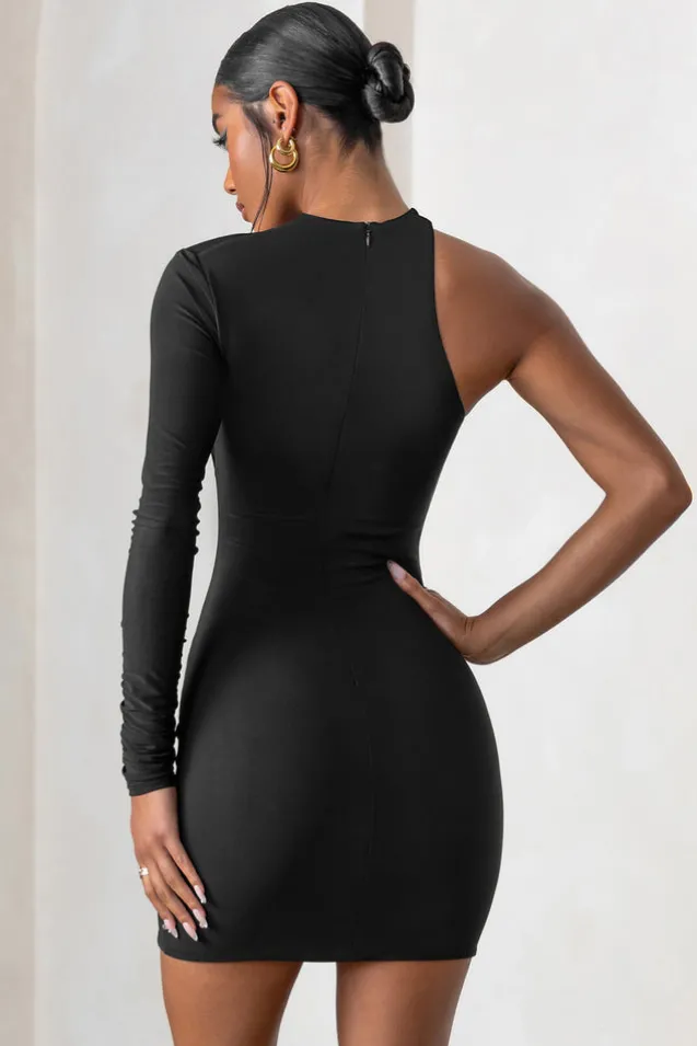 Perfect Touch | Black One Shoulder Long Sleeve Mini Dress