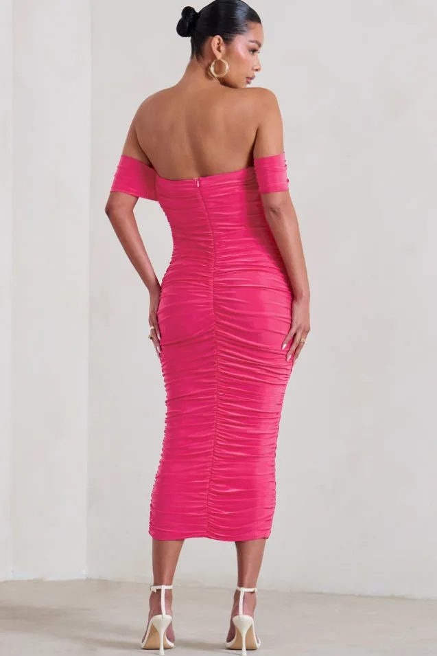 Plus One | Hot Pink Maternity Ruched Bardot Midi Dress