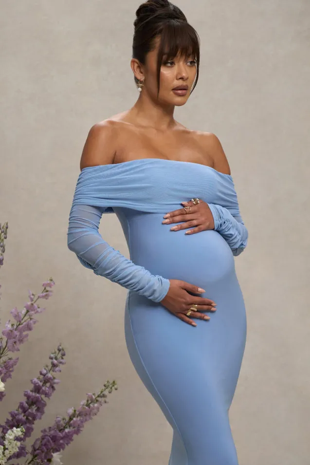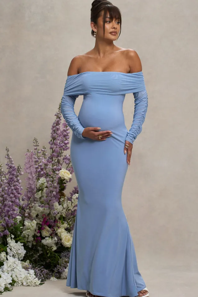 What maxi dress could be more perfect for a birthday or baby shower than this aptly-named option, Pretty Perfect? Designed in our signature stretch jersey with ruched mesh overlays, this blue maternity dress features a demure Bardot neckline, long sheer sleeves and a floor-sweeping skirt in a fishtail silhouette.Features- Premium stretch jersey and mesh- Fully ruched- Bardot neckline- Sheer mesh sleeves- Fishtail skirt- Maxi lengthSizing & FitModel is 5.’8.5″ and wears UK Size 8/US Size 4Product DetailsDesigned exclusively by Club L LondonDouble layered with good stretchPremium jersey and mesh in Powder Blue (95% Polyester, 5% Elastane)153cm total length