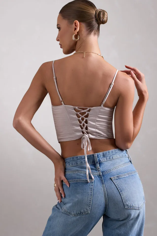 This aptly-named satin top certainly deserves a glass of prosecco, boasting a waist-cinching corset and a draped neckline held by slim cami straps. Easily dressed up or down to suit any and every special occasion, we know this champagne top will stay in your formal wardrobe for many seasons to come.Features- Premium heavy satin- Draped neckline- Wired balcony bra- Padded cups- Boned corset bodice- Adjustable cami straps- Self-tie lace closureSizing & FitModel is 5’8 and wears UK size 8/US size 4Product InformationDesigned exclusively by Club L LondonFully lined with no stretchPremium heavy satin in Champagne (100% Polyester)