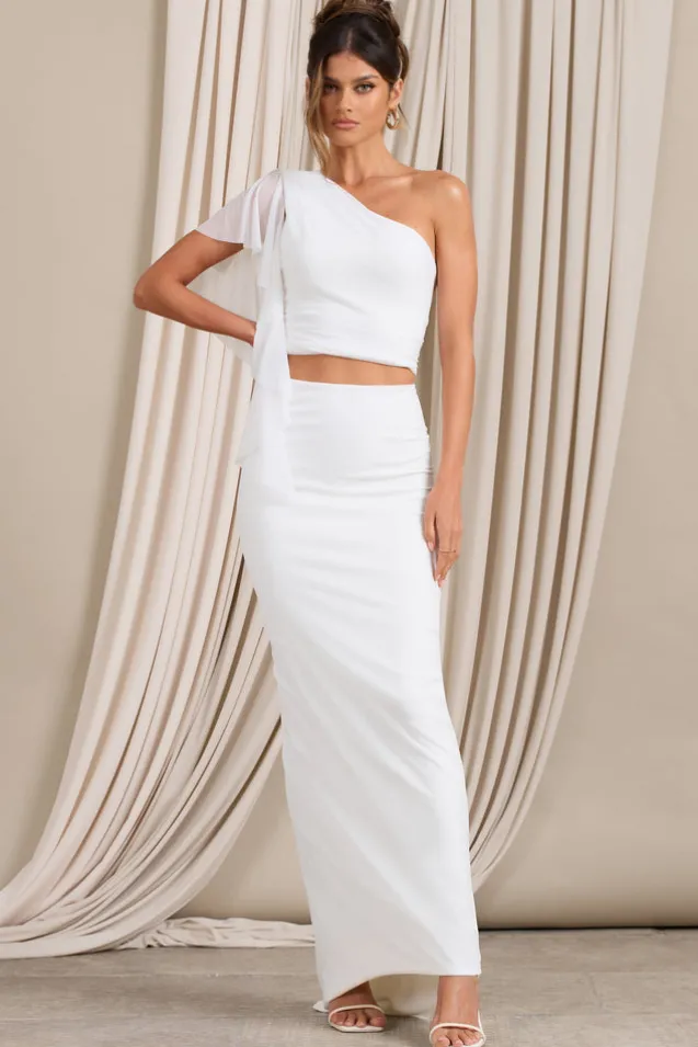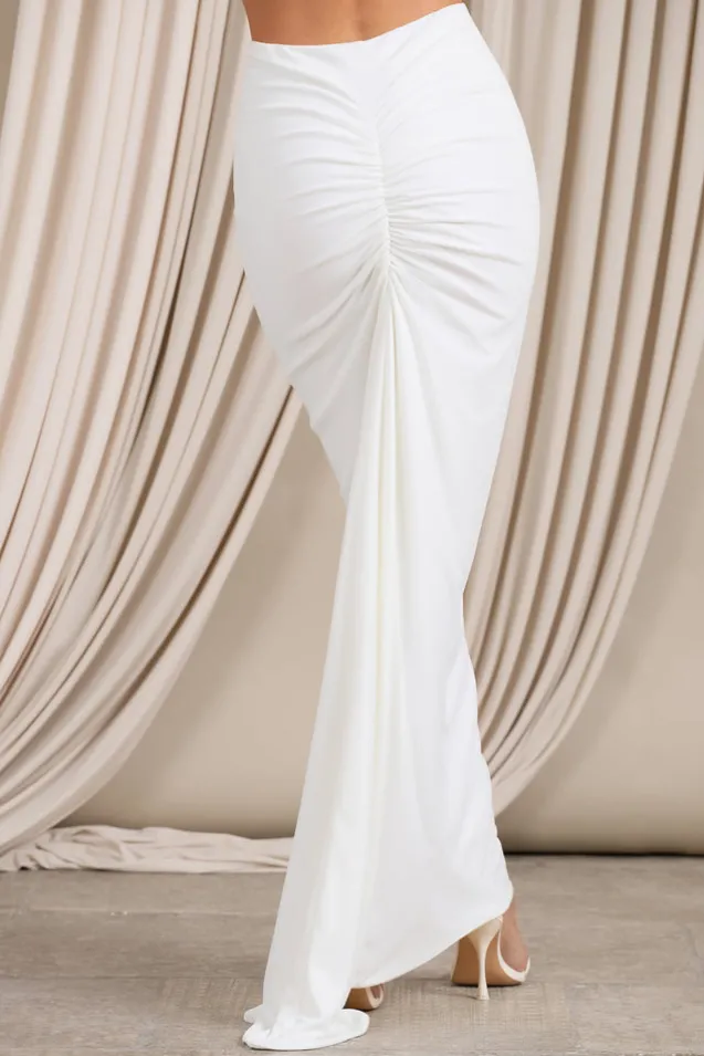 Whether you’re attending a wedding or a graduate gala, this white maxi skirt is your special occasion go-to. The long pencil skirt is designed in our sculpting stretch jersey then wrapped in a layer of luxurious chiffon. Also featuring a statement train and ruching to accentuate your curves from behind, Raye is the high-waisted skirt your figure deserves.Features- Premium stretch jersey and chiffon- High rise- Bodycon/ pencil fit- Bum ruching- Godet train- Maxi lengthSizing & FitModel is 5’8 and wearing Size UK 8/US 4Product InformationDesigned exclusively by Club L LondonDouble layered with good stretchPremium jersey and chiffon in White (95% Polyester, 5% Elastane)114cm total length