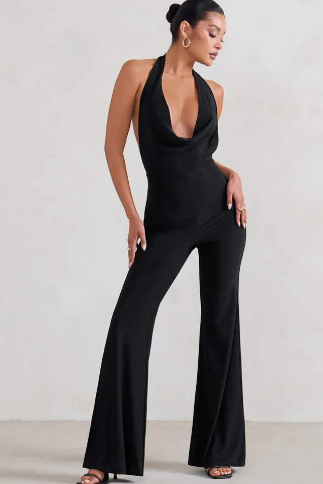 Meet Rhyla, the flattering black jumpsuit your figure deserves featuring wide legs and a plunging cowl neckline that buttons from behind a high halter collar. A great prom or wedding guest option, this stretchy and sculpting playsuit also boasts a scandalous open back. It’s no wonder why our Rhyla is such a bestseller.Features- Premium stretch jersey- Halter cowl neckline- Button closure- Open back- Wide legsSizing & FitModel is 5’8.5″ and wears UK size 8/US size 4Product InformationDesigned exclusively by Club L LondonDouble layered with good stretchPremium jersey in Black (95% Polyester, 5% Elastane)88cm inside leg length