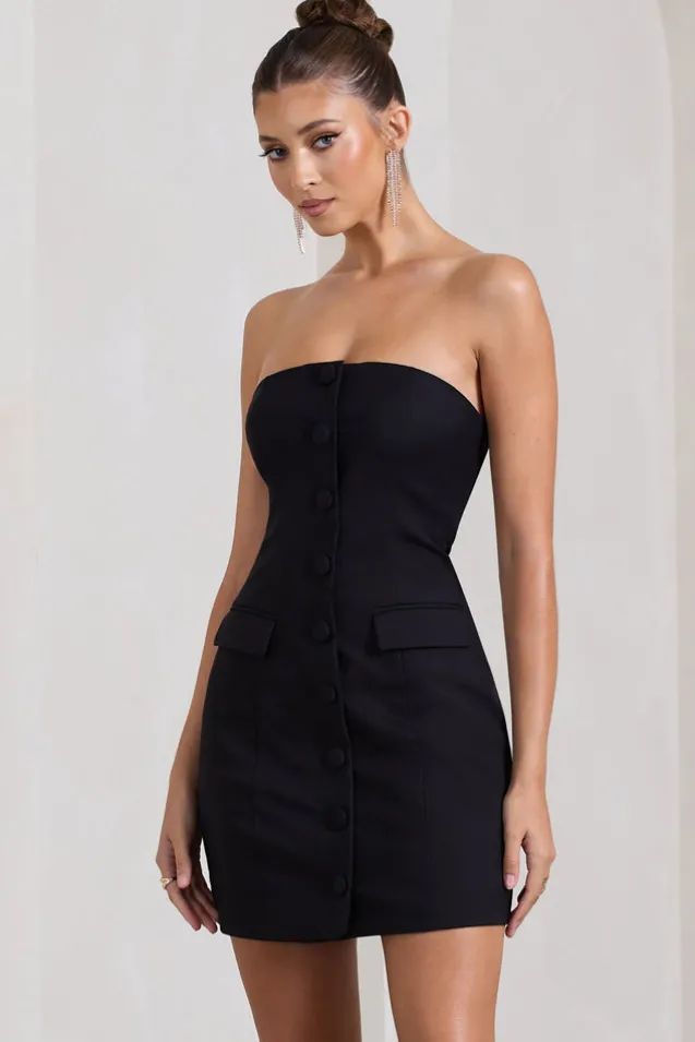 Rina | Black Strapless Tailored Mini Dress With Button Front