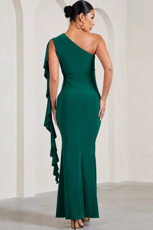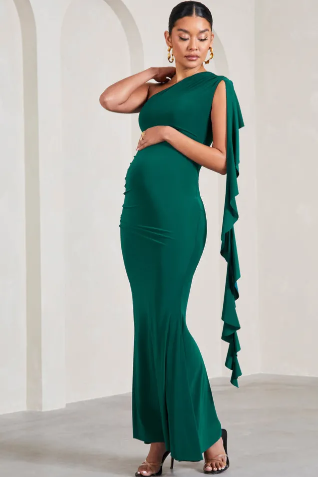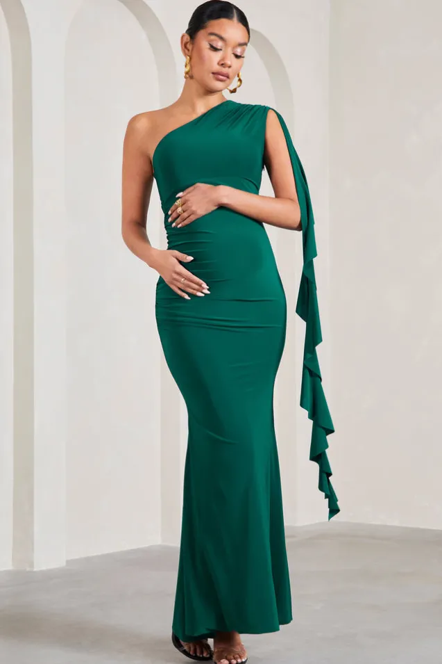 Rosalie | Bottle Green One-Shoulder Maternity Maxi Dress With Ruffles