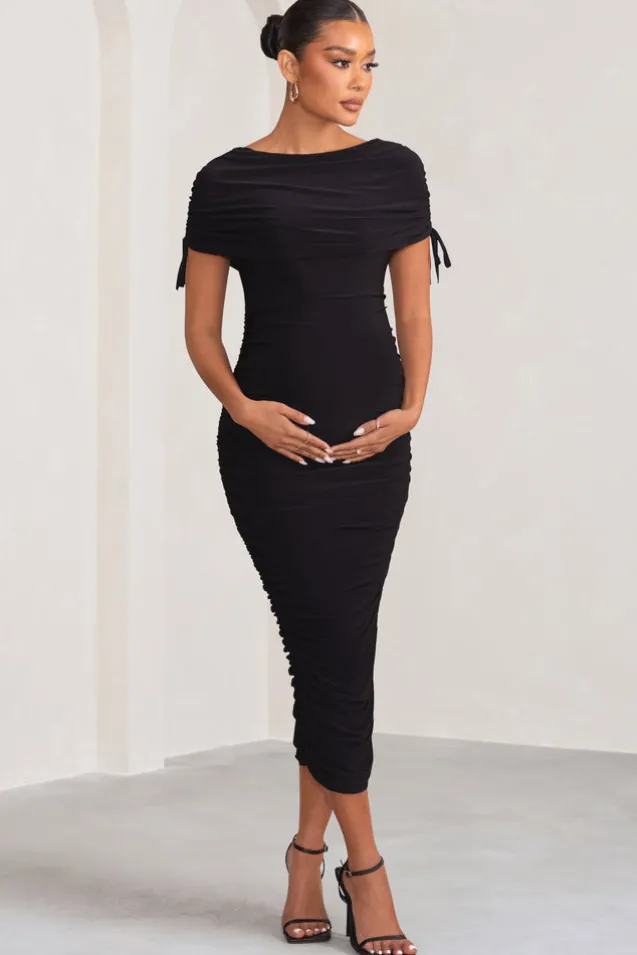 Roxanne | Black Ruched Bardot Maternity Midi Dress