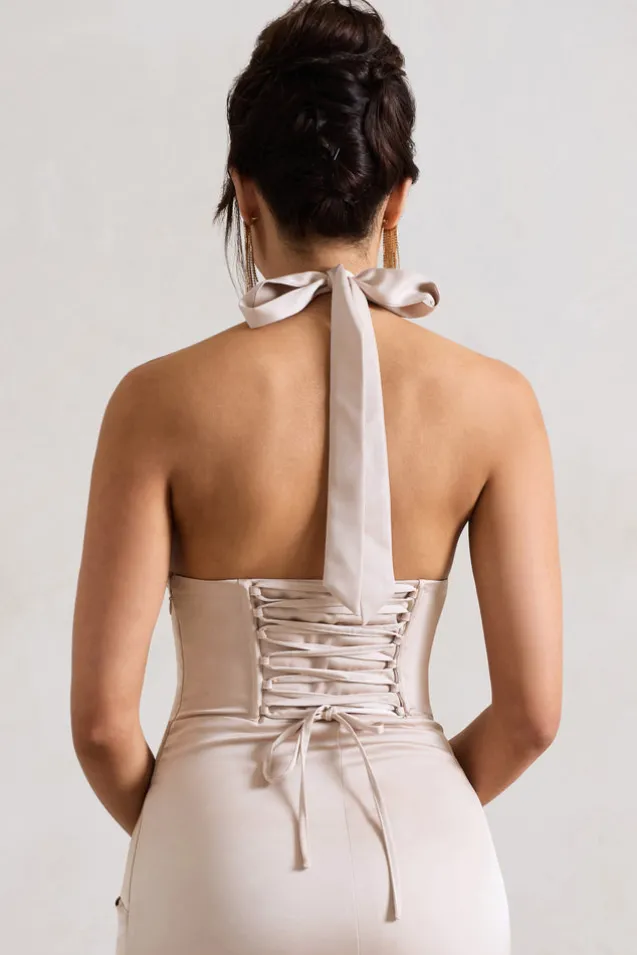 Made in a premium satin fabric to fit you like a glove, this champagne maxi dress is as flattering as it is flawless. Sacha boasts a boned corset bodice thats highlighted by a self-tie halter neckline and sculpting lace up back. Flourished with a twisted knot detail placed below the waist, this alluring piece has so many details to fall in love with. Features – Premium satin- Halter neckline – Boned corset bodice- Lace up back- Invisible zip closure- Twist detail- High leg split- Maxi length Sizing & Fit Model is 5’8 and wears UK size 8/US size 4 Product Information Designed exclusively by Club L London Unlined with no stretch Premium satin in Champagne (100% Polyester) 155cm total length