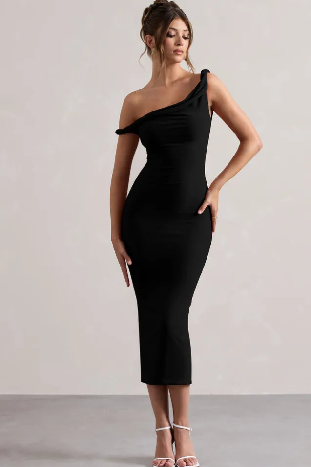 Be the first to review “Salome | Black Twisted Asymmetric Midi Dress” Cancel reply