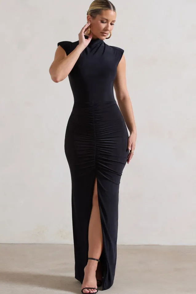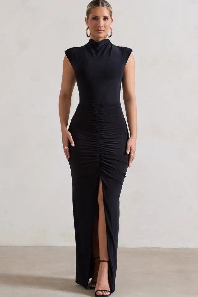Samira | Black Ruched High-Neck Split Maxi Dress