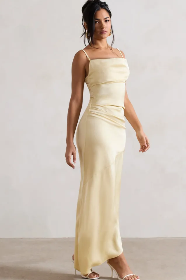 Carefully cut in a shining lemon satin, our maxi dress Santi is the ultimate occasion piece. This style features a cowl neckline and flowing bodice that drapes over your hips falling into an artful asymmetric skirt. Pair this style with our Lush shawl and some strappy stilettos for a perfect a destination wedding look.Features- Premium satin- Cowl neckline- Asymmetric hem- Adjustable cami straps- Invisible zip closure- Maxi lengthSizing & FitModel is 5’6 and wears UK size 8/US size 4Product InformationDesigned exclusively by Club L LondonUnlined with little stretchPremium satin in Lemon (100% Polyester)150cm total length