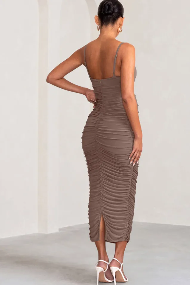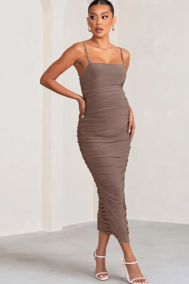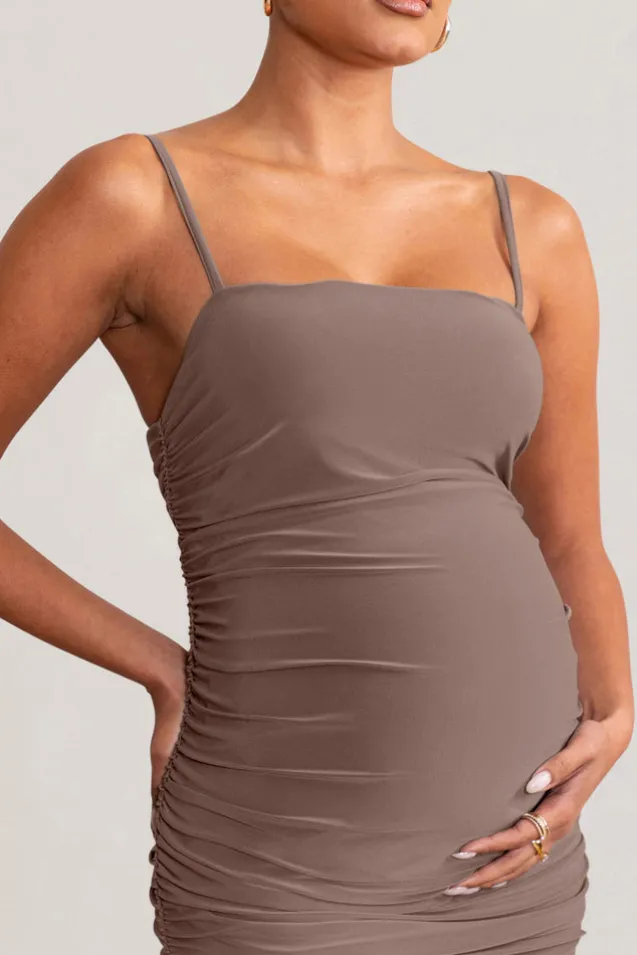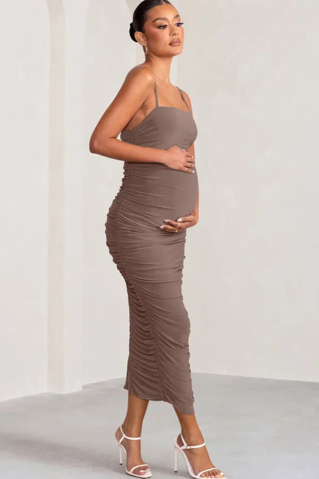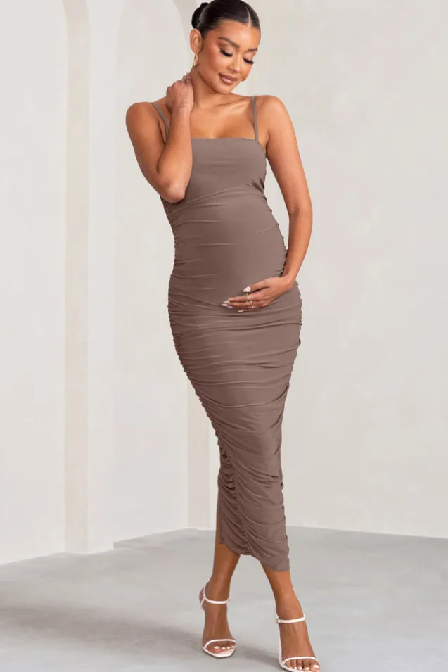 Sentimental | Mocha Maternity Midi Dress with Cami Straps and Ruching